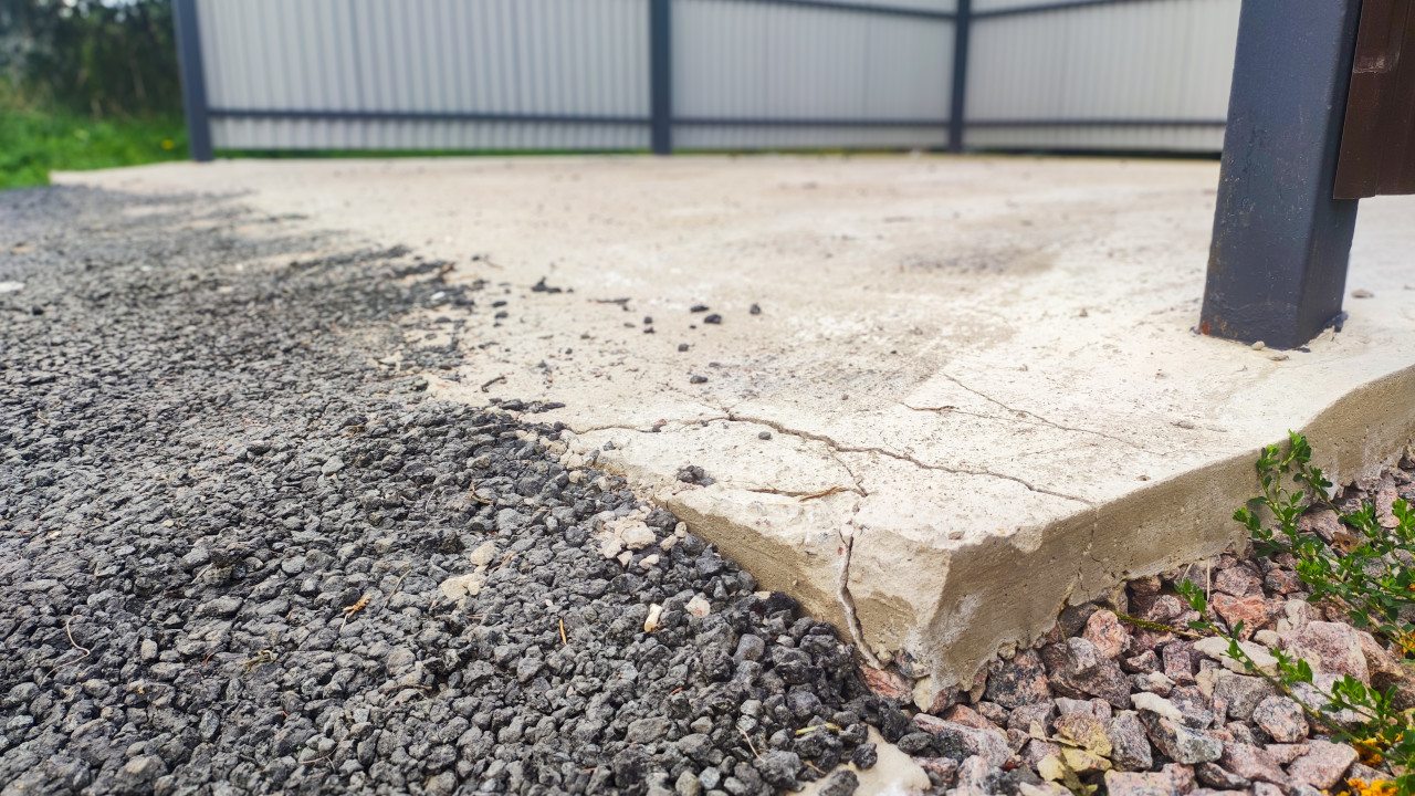 Сколотая кромка бетонной плиты и щебёночная отсыпка возле ограждённой площадки