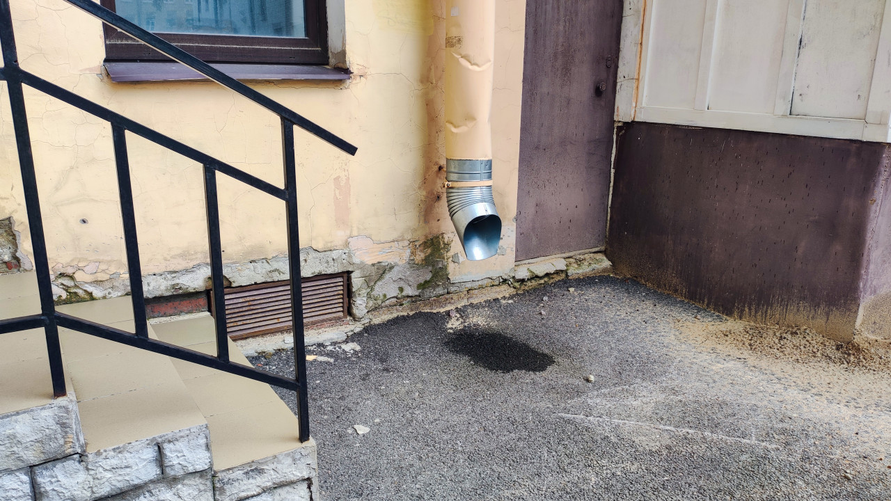 Водосточная труба у фасада дома и мокрое пятно на дворовом покрытии возле основания стены