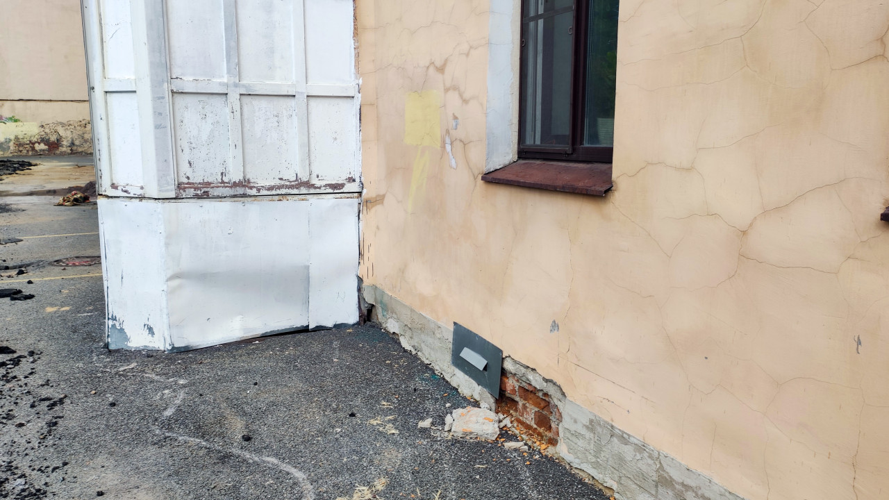 Трещины штукатурки и оголённый кирпич у цоколя рядом с белым эркером и окном на фасаде здания