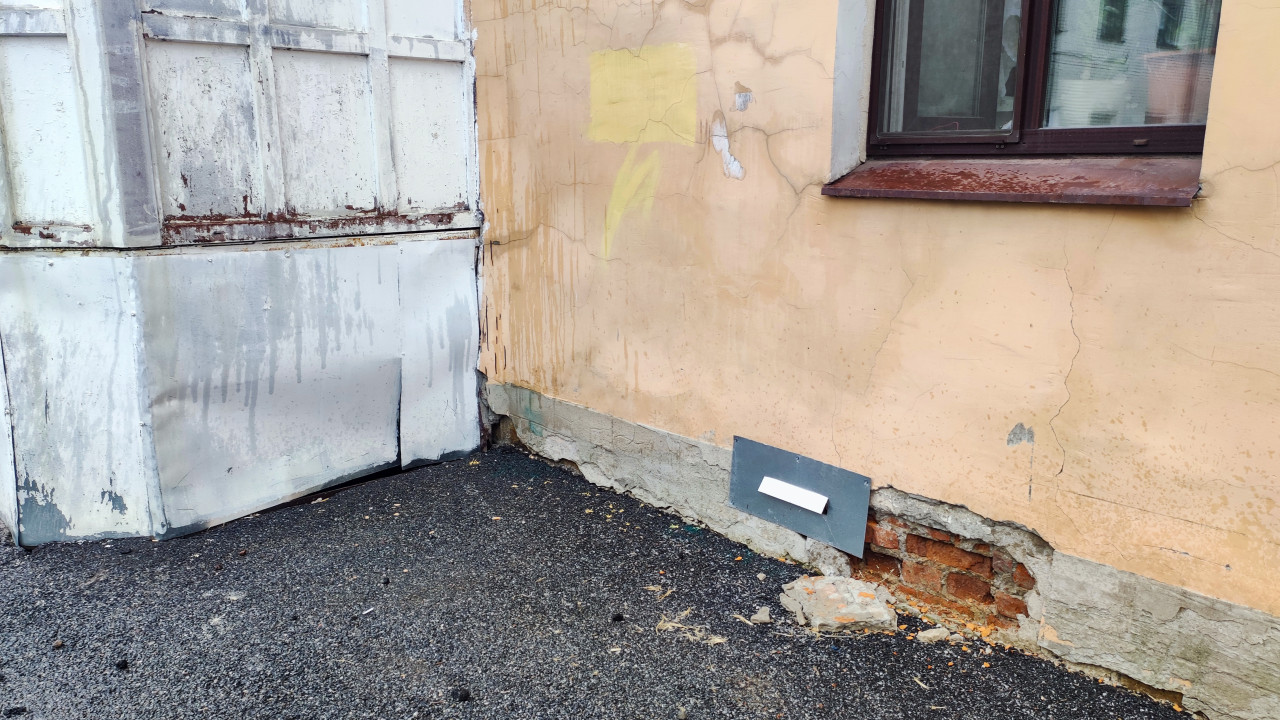 Ржавые металлические створки и следы намокания на углу здания с повреждённой отделкой цоколя