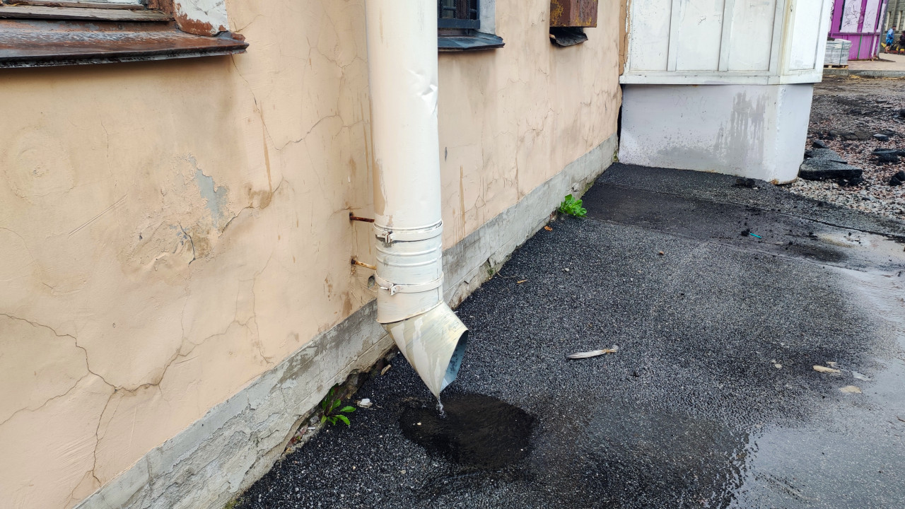 Повреждённая штукатурка цоколя и следы сырости у основания стены рядом с влажным дворовым покрытием