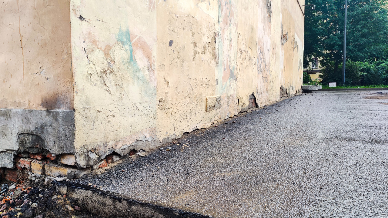техническое состояние обследование строительный контроль дефекты повреждения износ строительство здание фасад угол штукатурка отслоение сколы трещины цоколь оголённый кирпич кирпичная кладка отмостка асфальт пешеходная дорожка проход площадка придомовая территория благоустройство ремонт ремонт фасада ремонт цоколя двор деревья городская средаПохожие фотографии