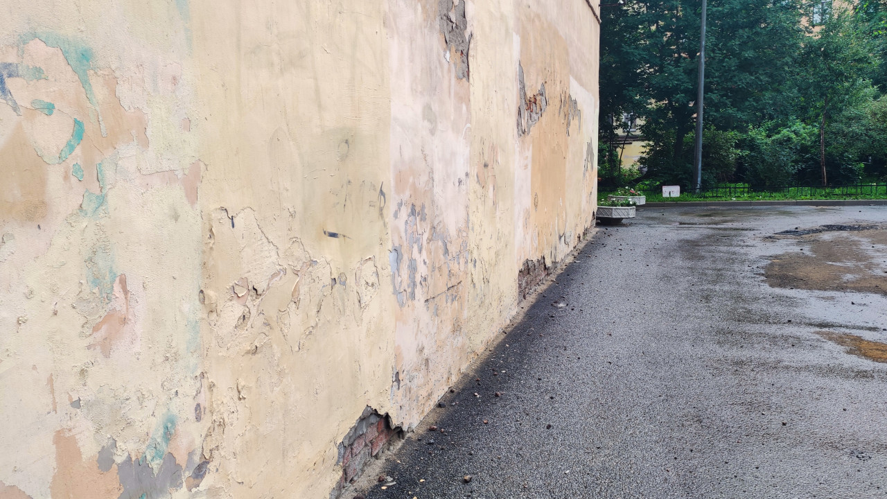 техническое состояние обследование строительный контроль дефекты повреждения износ строительство здание фасад стена штукатурка трещины пятна цоколь оголённый кирпич кирпичная кладка асфальт мокрый асфальт лужи вода отражение дорожка придомовая территория двор деревья влажность эксплуатация здания диагностика ремонт ремонт фасада городская средаПохожие фотографии