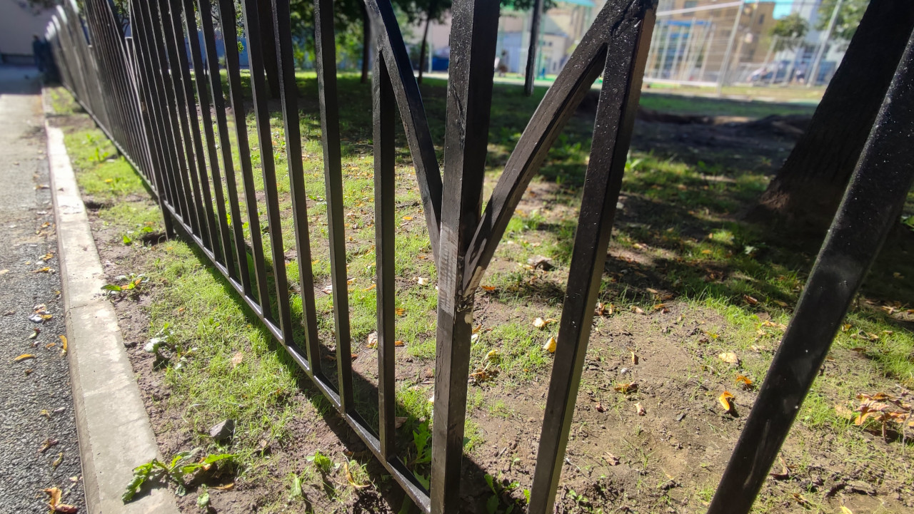 техническое состояние обследование строительный контроль дефекты повреждения износ город ограждение металлический забор перила повреждение деформация металла вмятина аварийное состояние безопасность двор тротуар бордюр асфальт грунт трава газон тень солнечный день уличная инфраструктура благоустройство коммунальные службы ремонт ограждения городская среда крупный план деталь повреждённая конструкция парковая зонаПохожие фотографии