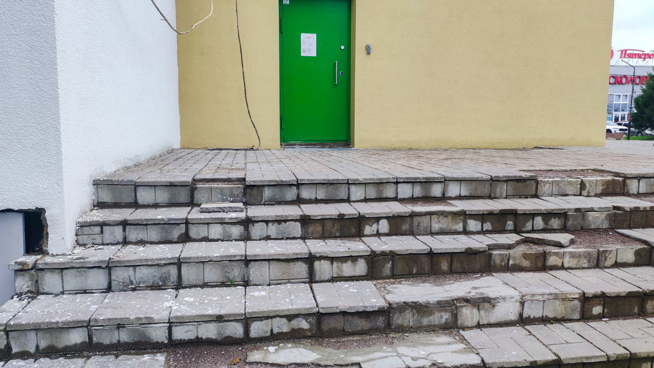 техническое состояние обследование строительный контроль дефекты повреждения износ строительство ремонт входная группа вход в здание бетонные ступени лестница сколы трещины разрушенная плитка отслоение неровности грязь восстановление реконструкция контроль качества зеленая дверь металлическая дверь фасад штукатурка кабель безопасность городская инфраструктураПохожие фотографии