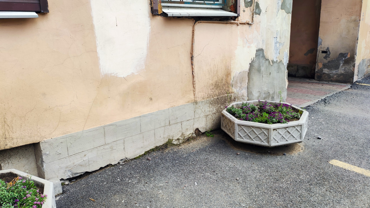 Трещины и потёки на стене дома возле входной арки и уличных вазонов с цветами