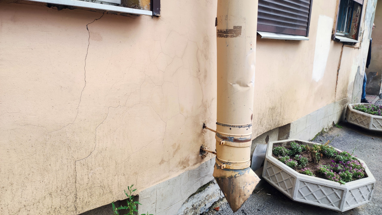 Водосток у стены дома и повреждения отделки рядом с бетонным вазоном на тротуаре