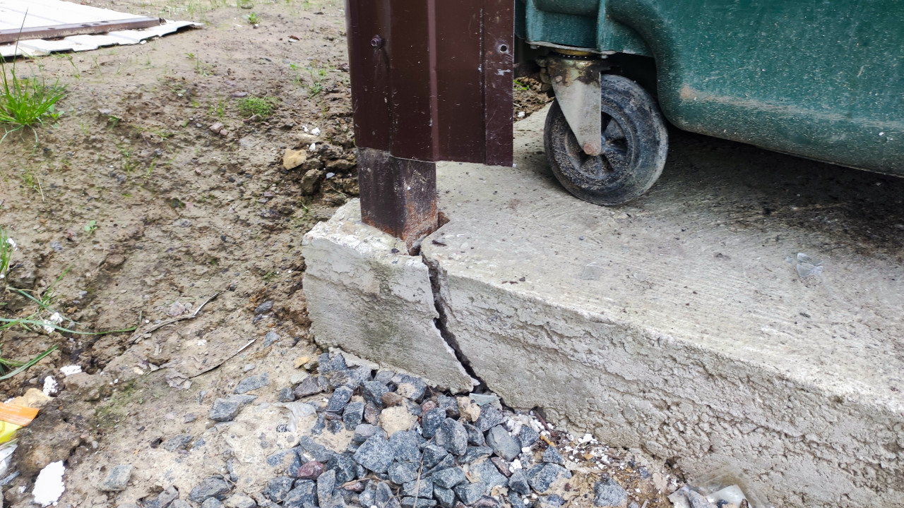 Трещины и сколы бетонного основания у металлической стойки рядом с мусорным контейнером