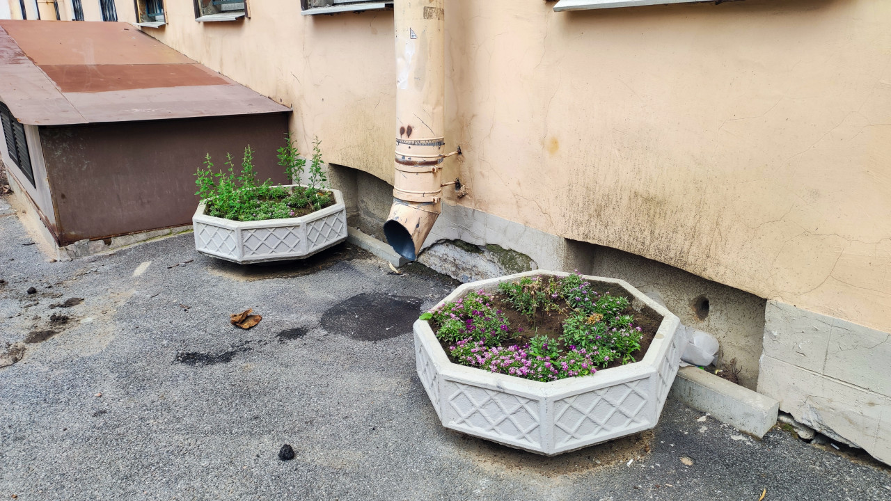 техническое состояние обследование строительный контроль дефекты повреждения износ фасад водосточная труба водоотвод здание жилой дом отмостка асфальт трещины потёки следы влаги штукатурка ремонт ремонт фасада ремонт отмостки герметизация придомовая территория тротуар бордюр бетонные вазоны уличные клумбы растения благоустройство эксплуатация здания городская среда коммунальные проблемыПохожие фотографии