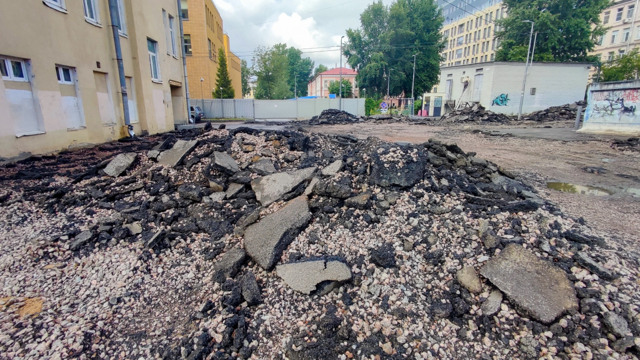 Куча асфальтового лома и щебня на площадке ремонта дворового проезда