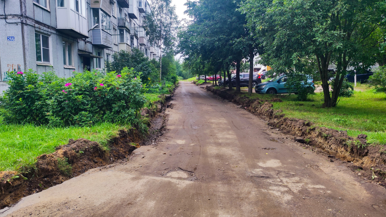 дорога проезд покрытие поверхность дорожные работы город двор дворовая территория внутриквартальный проезд ремонт дороги снятый асфальт основание дороги щебень грунт выравнивание траншеи земляные работы насыпи земли строительные работы благоустройство коммунальные службы ремонт инфраструктуры жилой квартал многоквартирные дома автомобили парковка деревья кустарники мокрая поверхность после дождя городская среда ЖКХПохожие фотографии
