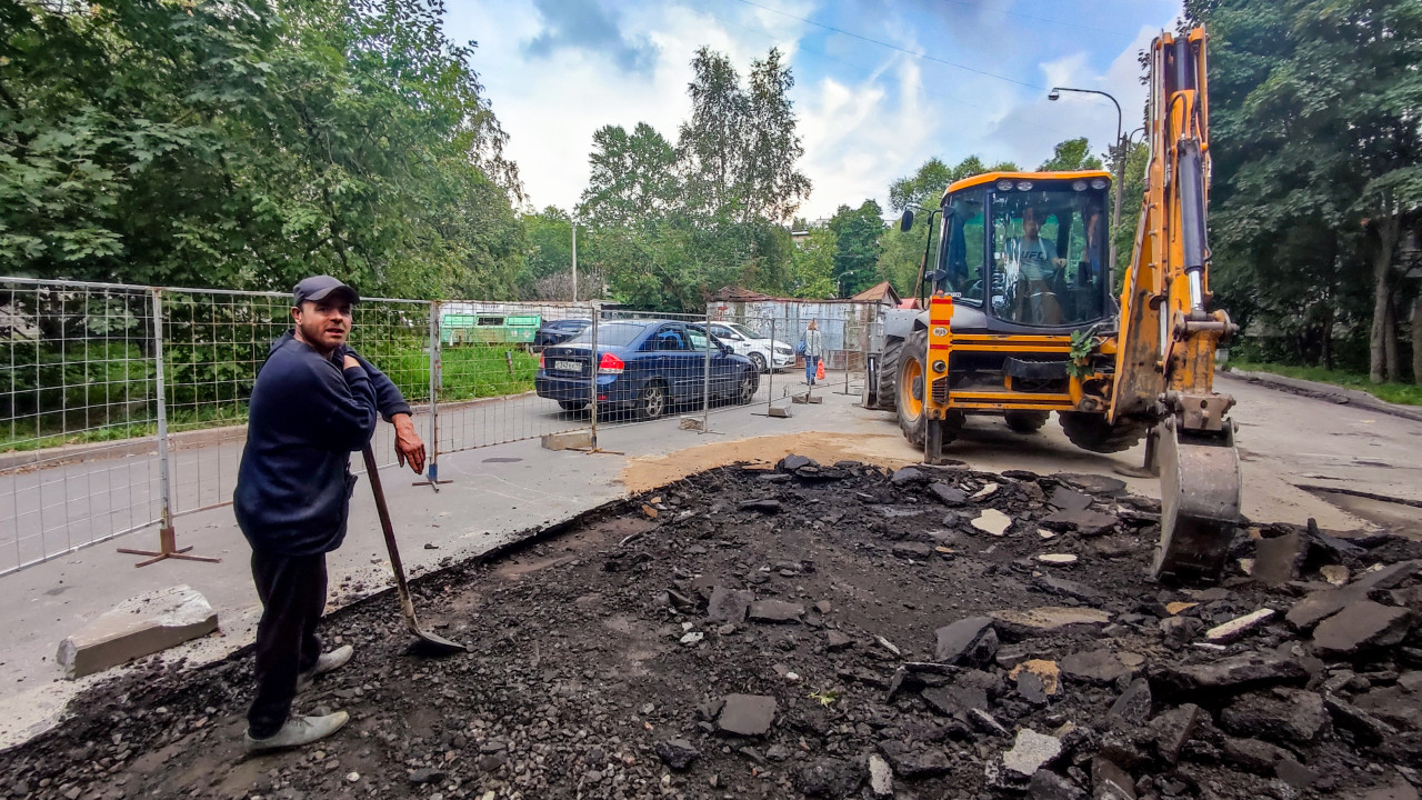 Рабочие и экскаватор-погрузчик на участке фрезерования асфальта во дворе жилого квартала