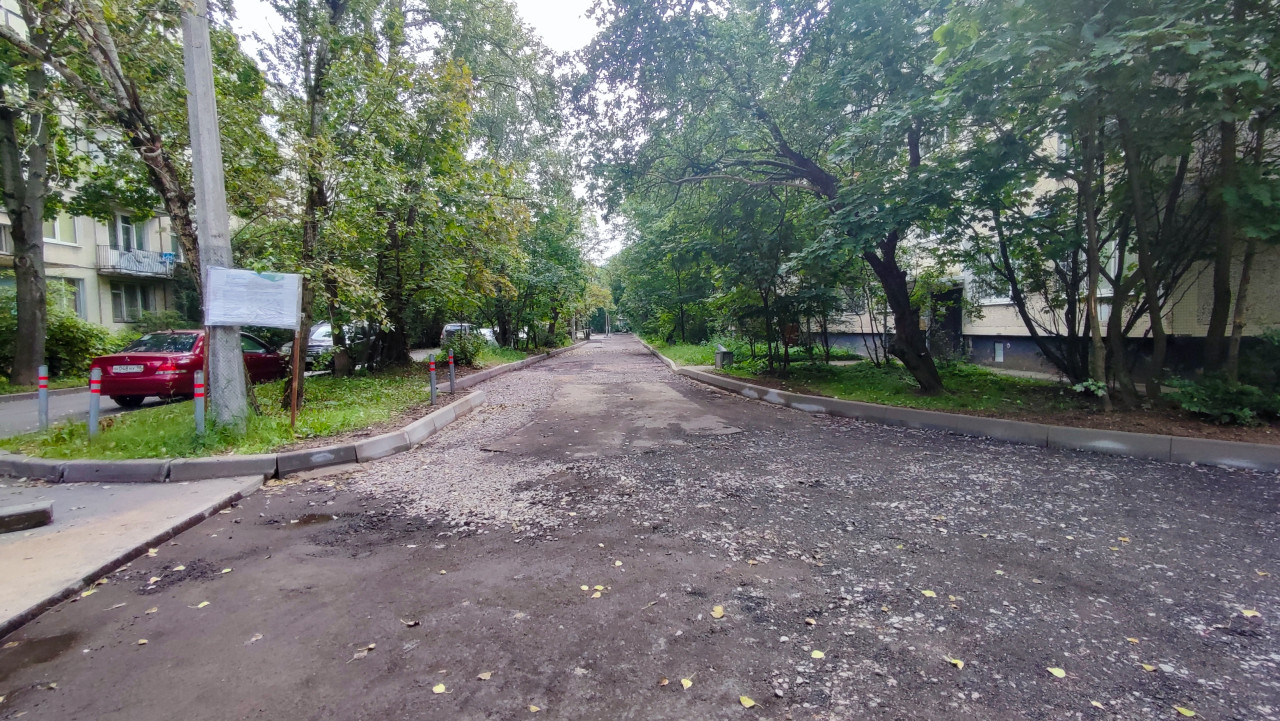 Дворовой проезд с фрезерованным асфальтом и щебнем между жилыми домами и деревьями