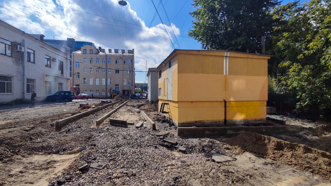 дорога проезд покрытие поверхность дорожные работы город инфраструктура ремонт строительство реконструкция разобранная дорога щебень песок грунт куча земли бордюрный камень бордюры подготовка основания выравнивание строительная площадка городские здания двор техническая будка трансформаторная коммуникации провода линии электропередачи уличное освещение техника экскаватор вдали облачное небо благоустройство территории ремонт покрытияПохожие фотографии
