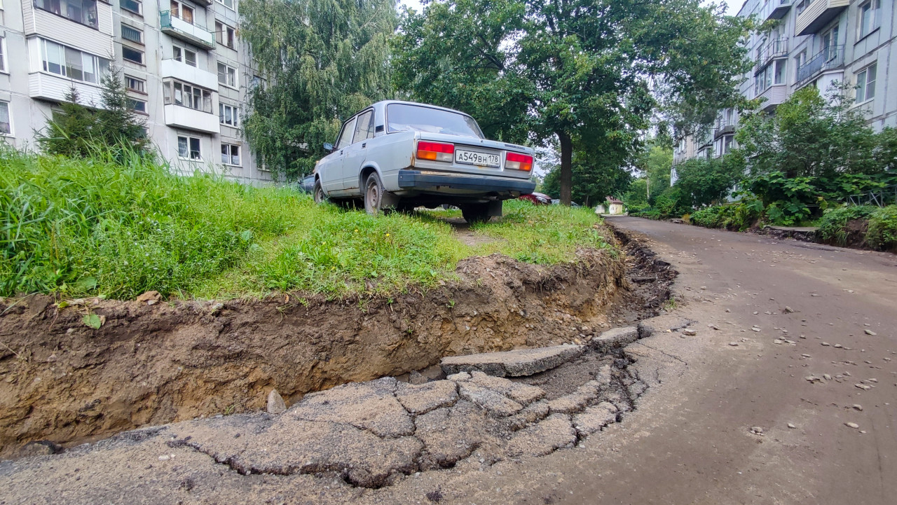 дорога проезд покрытие поверхность дорожные работы город двор дворовой проезд асфальт трещины разрушение покрытия обочина размыв эрозия траншея выемка земляные работы грунт осыпание щебень грязь влажная почва благоустройство ремонт безопасность многоквартирные дома деревья трава парковка легковой автомобиль городская инфраструктураПохожие фотографии