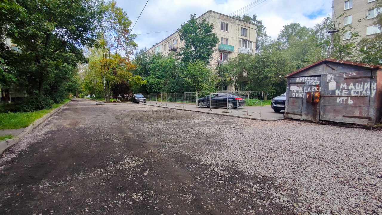 дорога проезд покрытие поверхность дорожные работы город двор жилая застройка многоэтажные дома ремонт двора благоустройство щебень подготовка основания бордюр бордюрный камень временное ограждение строительная зона техника безопасности припаркованные автомобили газон деревья гаражи металлические гаражи коррозия облупившаяся краска граффити городской пейзаж ремонт покрытия укладка асфальта коммунальные службыПохожие фотографии