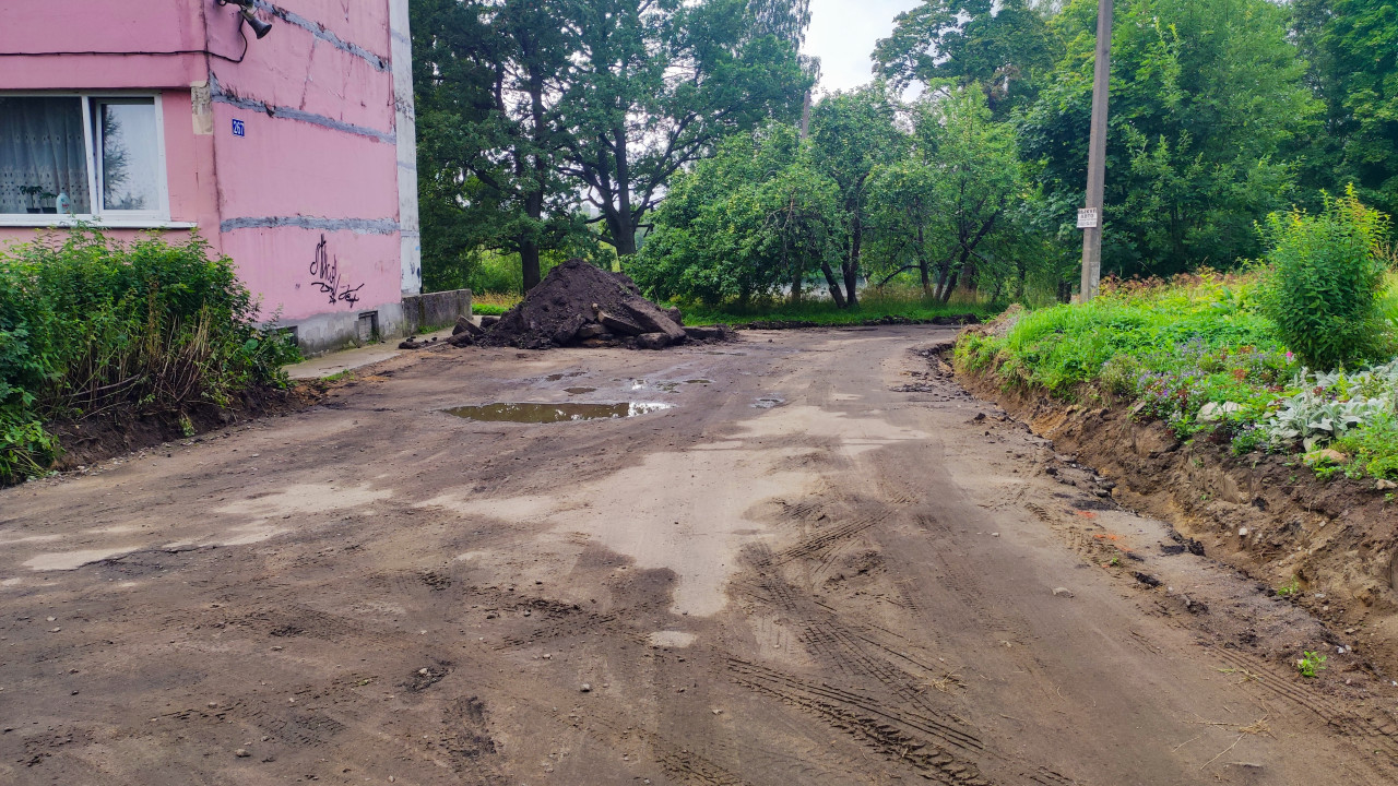 Площадка земляных работ у жилого дома с кучей грунта и лужами на проезде