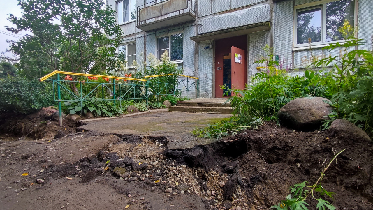 Разрушенный асфальт и яма у подъезда с открытой дверью