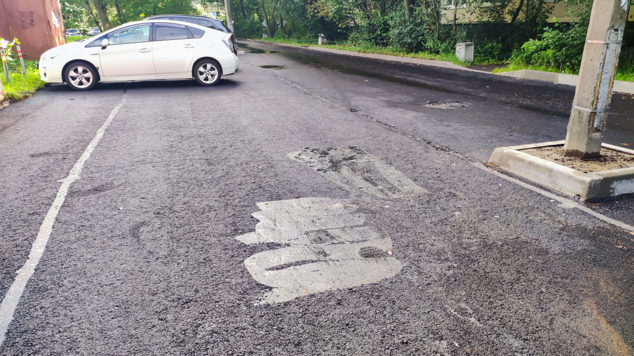 Заплатка асфальта вокруг люка и парковочной разметки на дворовой дороге