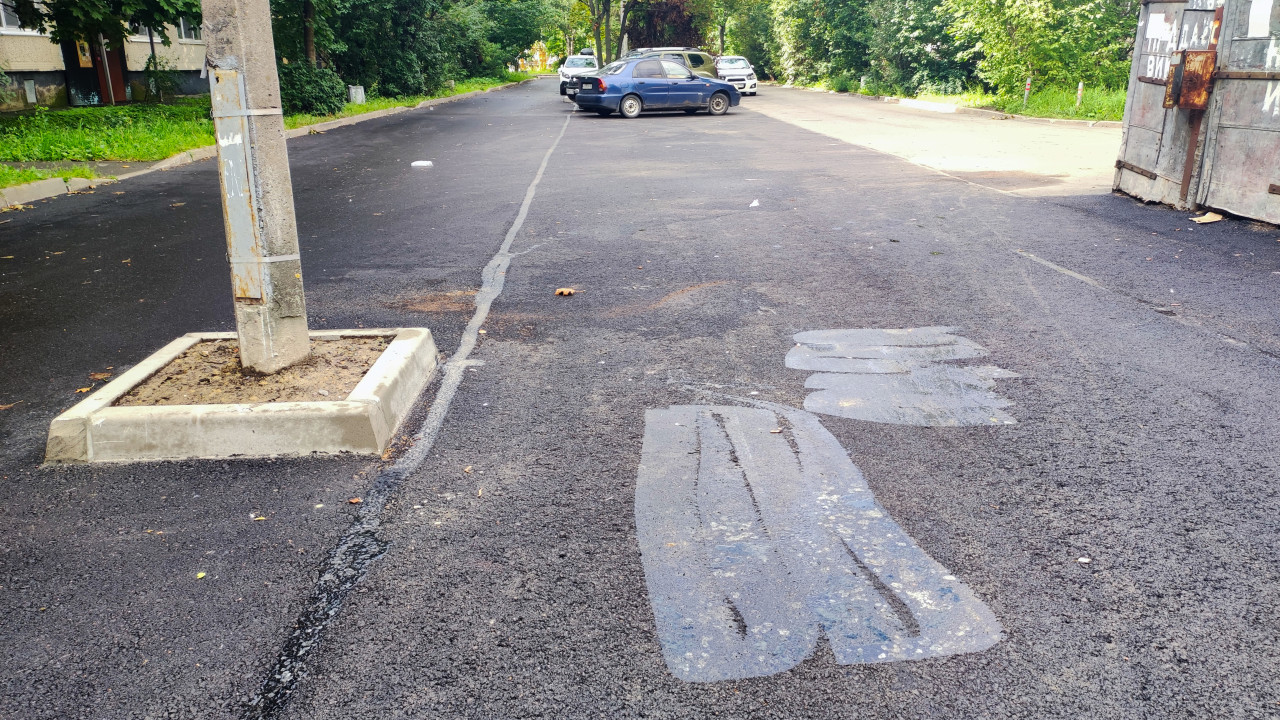 Свежий асфальт на дворовом проезде с разметкой ремонта и парковкой у деревьев