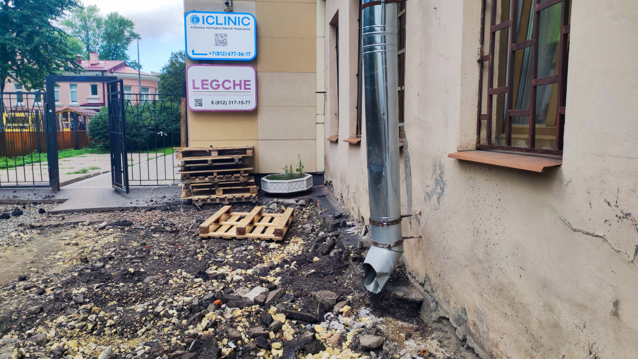 дорога проезд покрытие поверхность дорожные работы город общественное здание фасад цоколь окна с решетками водосток водосточная система металлическая труба ливневая канализация сток воды инженерные коммуникации монтаж ремонт капитальный ремонт обслуживание здания строительные работы строительная пыль щебень поддоны склад стройматериалов рекламная вывеска указатель наружная реклама ICLINIC LEGCHE городская инфраструктура дневной свет уличная съемкаПохожие фотографии