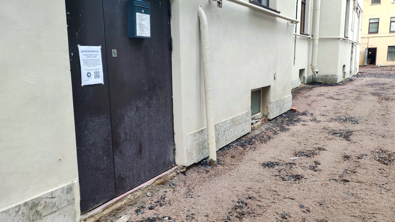 дорога проезд покрытие поверхность дорожные работы архитектура входная группа технический вход дверь металлическая дверь подъезд цоколь фасад жилой дом объявление информационное сообщение табличка замок ручка двери обслуживание дома коммунальные службы ЖКХ двор тротуар щебень песок ремонт эксплуатация здания городская среда безопасность хозяйственный вход инфраструктураПохожие фотографии
