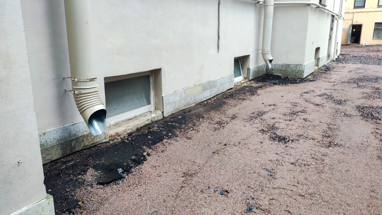дорога проезд покрытие поверхность дорожные работы строительство архитектура фасад жилой дом цоколь подвальное окно решетка на окне водосток водосточная труба слив воды отвод воды ливневая система дренаж щебёночная отсыпка гравий песок отмостка фундамент защита от влаги ремонт обслуживание здания инженерные коммуникации двор тротуар городская среда детализация техническое состояниеПохожие фотографии