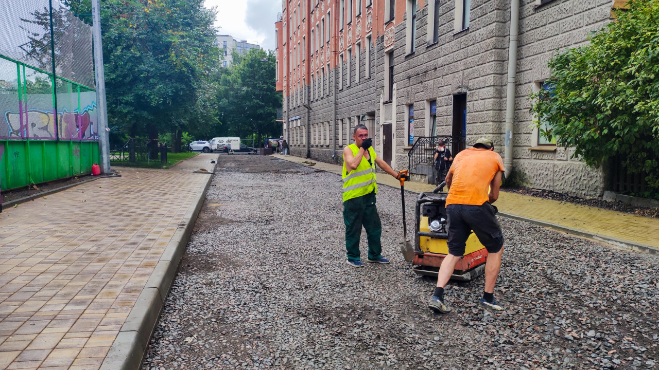 дорога проезд покрытие поверхность дорожные работы строительство благоустройство ремонт двора дворовая территория городской двор жилой дом фасад здания укладка щебня щебень гравий основание подготовка основания уплотнение трамбовка виброплита плита вибрационная строительные работы коммунальные работы рабочие спецодежда светоотражающий жилет лопата ручной инструмент тротуарная плитка бордюр спортивная площадка ограда облачная погодаПохожие фотографии