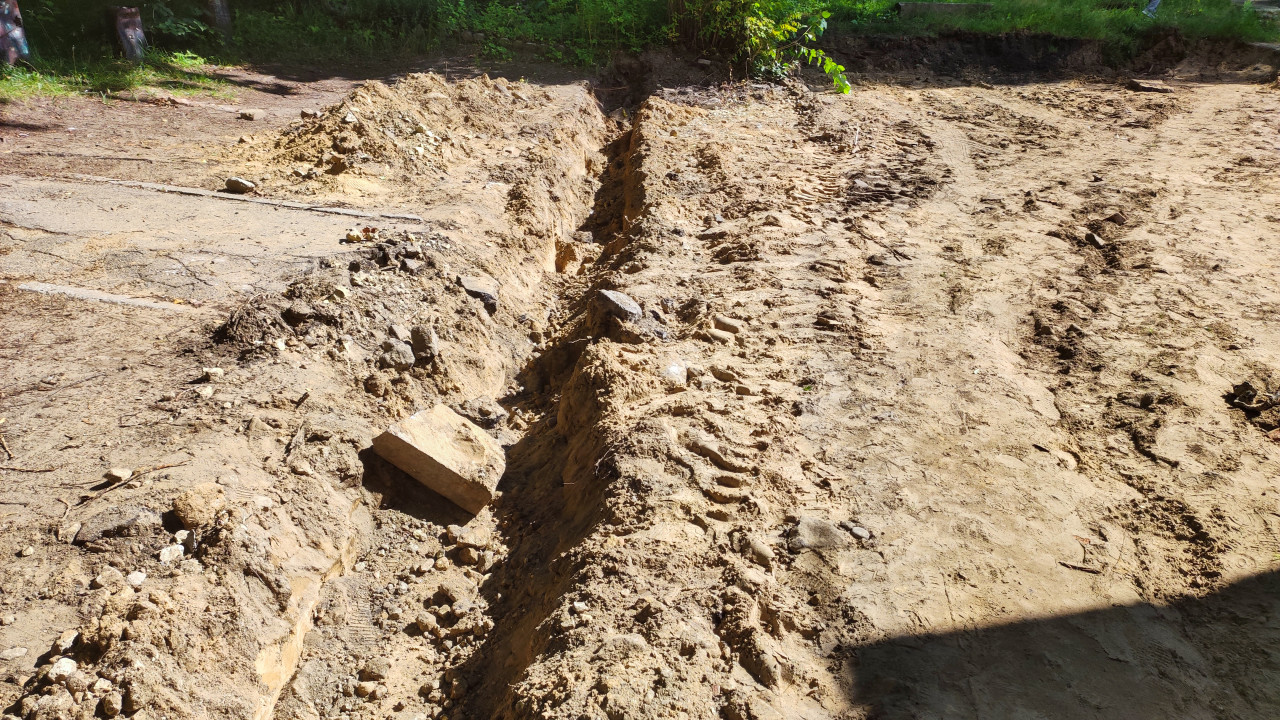 Фрагмент траншеи на дворовом проезде: грунт разрезан вдоль линии работ, видны неровные края выемки, песчано-глинистая почва и россыпь камней. На поверхности заметны колеи и следы перемещения грунта, рядом проходит полоса травы и кустарников, вдалеке начинается зелёная зона с деревьями. Съёмка выполнена на улице при дневном освещении, характерном для тёплого сезона. Изображение подойдёт для материалов о разработке грунта, прокладке подземных коммуникаций, организации строительной площадки и оценке состояния земляного полотна.