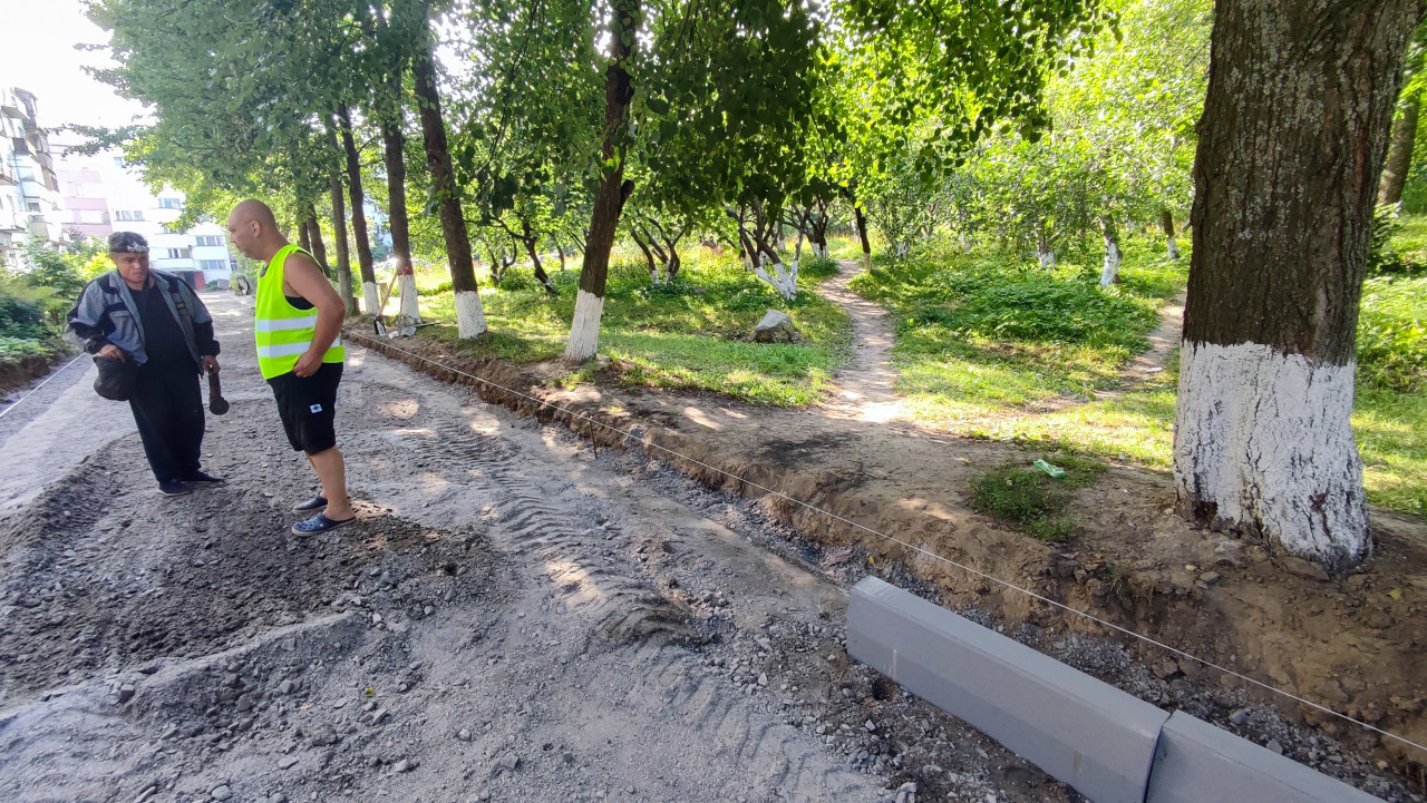 дорога проезд покрытие поверхность дорожные работы благоустройство строительство ремонт дорожек дворовая территория парк зелёная зона рабочие сигнальный жилет обсуждение организация работ разметка разметочный шнур бордюр бордюрный камень щебень подсыпка грунт уплотнение следы техники канавка подготовка основания коммунальные работы городская инфраструктура деревья побелка лето дневной светПохожие фотографии