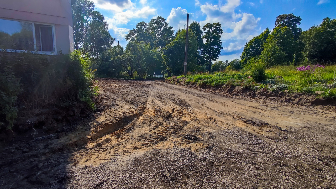 дорога проезд покрытие поверхность дорожные работы строительство ремонт благоустройство инфраструктура двор придомовая территория грунтовая дорога щебёночная дорога основание под асфальт планировка грунта утрамбованный грунт колея следы шин песок щебень гравий обочина газон кустарник деревья столб линия электропередачи облака дневное небо летний день городская среда ЖКХПохожие фотографии