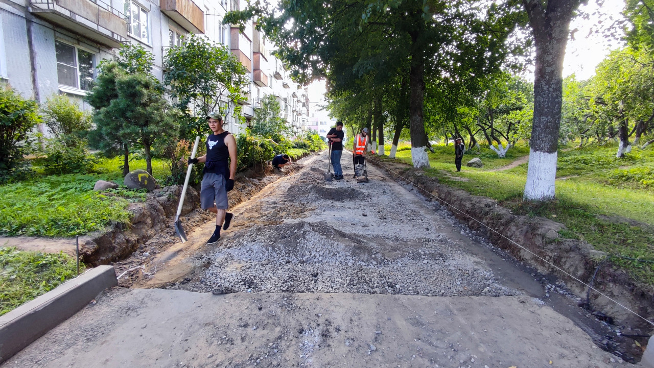 дорога проезд покрытие поверхность дорожные работы ремонт строительство благоустройство дворовая территория жилой дом многоквартирный дом основание дороги щебень песок подсыпка траншея земляные работы бордюр бордюрный камень выравнивание рабочие ручной труд лопата разметочная нить техника безопасности зелёные насаждения деревья лето городской двор инфраструктураПохожие фотографии