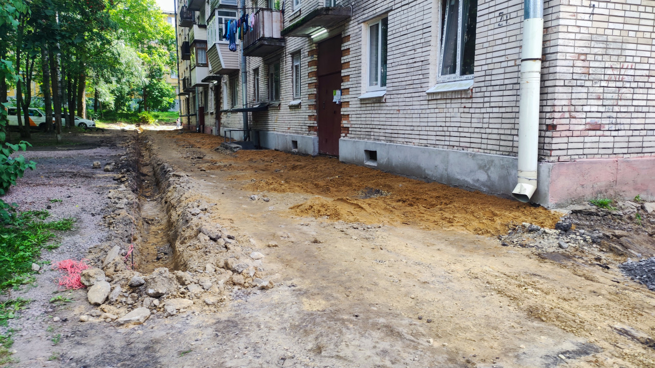 дорога проезд покрытие поверхность дорожные работы город инфраструктура двор дворовой проезд ремонт дороги строительство демонтаж покрытия снятый асфальт песок грунт камни строительная крошка выемка обочина разметка метки на земле подготовка под бордюр подъезд дверь кирпичный дом фасад окна цоколь тень деревьев строительная площадка благоустройство ЖКХПохожие фотографии