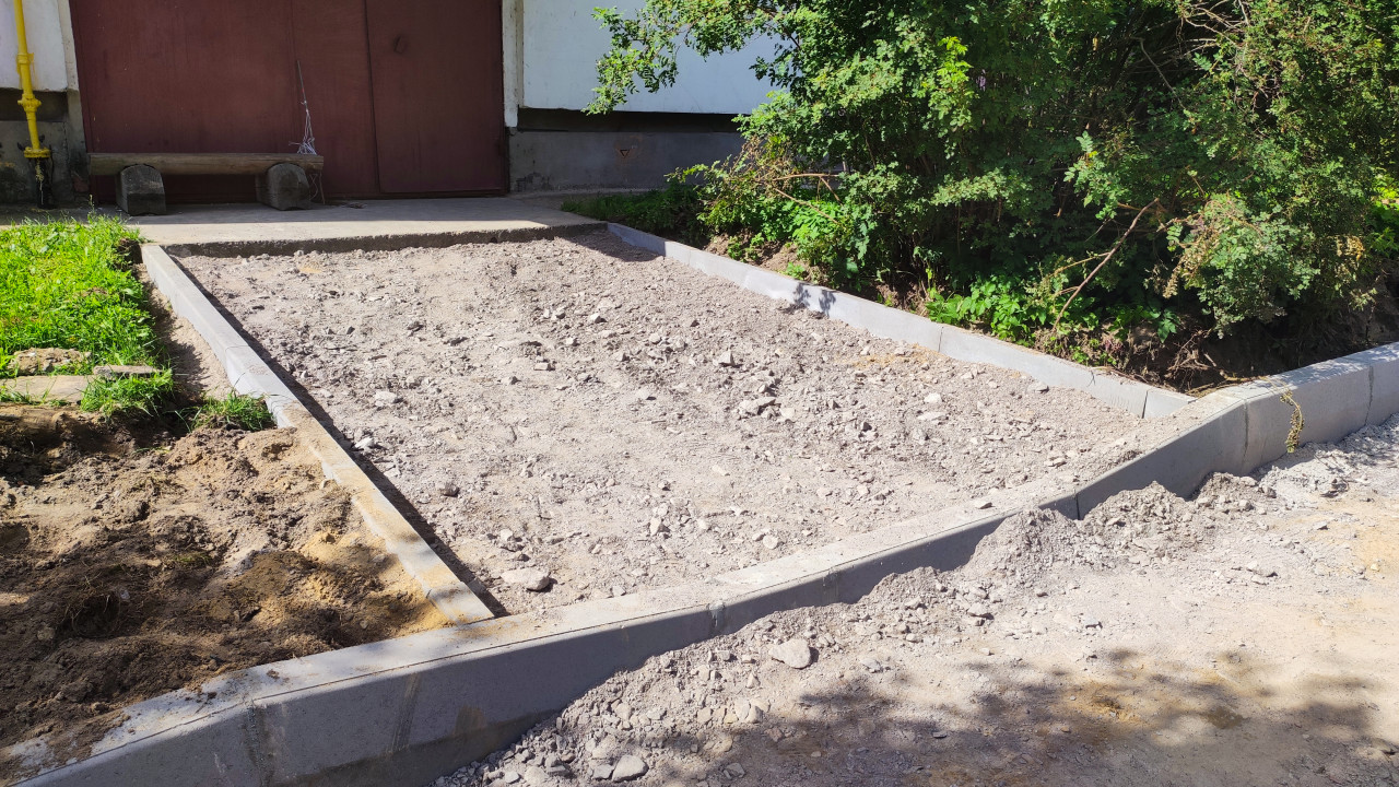 Щебёночная подсыпка в ограниченном бордюрами проезде у подъезда жилого дома перед укладкой покрытия