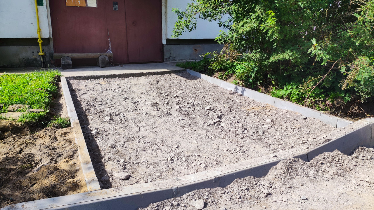 Участок у подъезда с уложенными бордюрами и щебёночной подсыпкой, подготовленный под тротуарное покрытие
