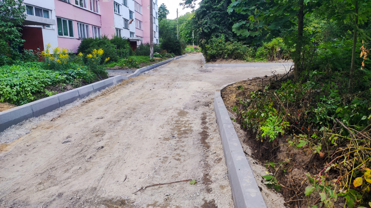 Дворовой проезд в ремонте с щебёночным основанием, бордюрами и жилыми домами на фоне