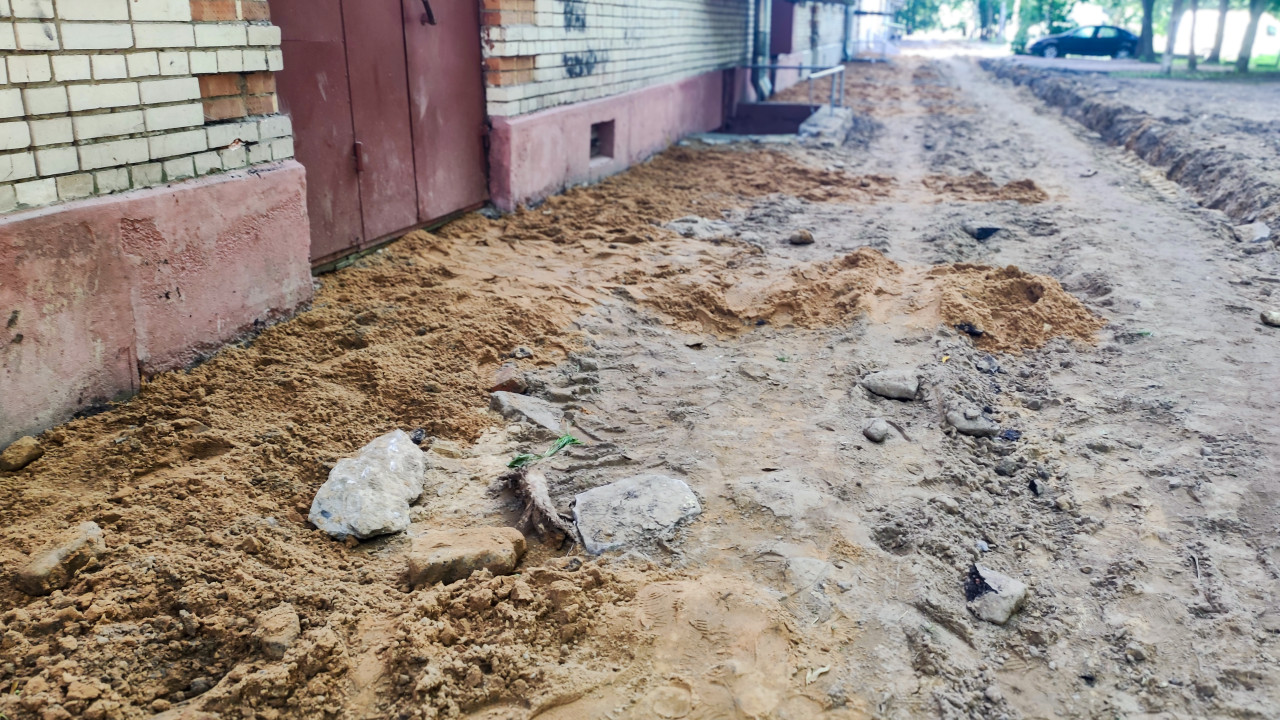 дорога проезд покрытие поверхность дорожные работы город строительство ремонт двор придомовая территория многоквартирный дом фасад кирпичная стена земляные работы разрытый грунт песок щебень подсыпка основание подготовка выравнивание строительный процесс благоустройство коммунальные работы цоколь технический вход окна дорожка строительная зона лето дневной свет инфраструктура ремонт территорииПохожие фотографии