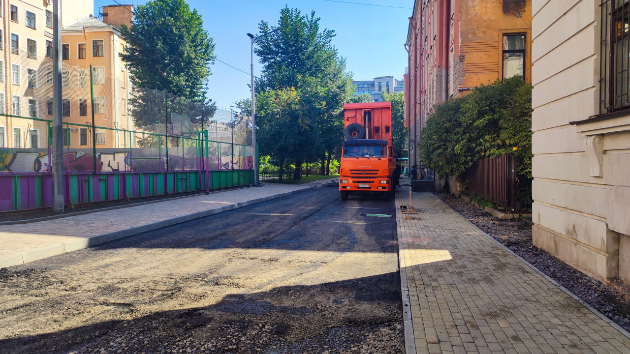 Оранжевый самосвал КамАЗ на ремонтируемом проезде с новым асфальтом и тротуарной плиткой