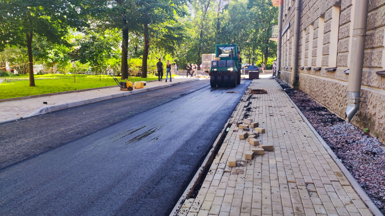 Снимок сделан во время укладки покрытия: дорожный каток движется по свежему тёмному асфальту, на поверхности видны полосы от укатки и следы битумной эмульсии. Справа проходит тротуар из плитки вдоль каменного фасада здания, на плитке лежат рассыпанные элементы мощения и пятна асфальтовой крошки. В кадре заметны открытые люки, виброплита и канистры для работ; слева зелёная зона с деревьями и газоном, на дальнем плане идут прохожие. Фото подходит для публикаций о дорожном строительстве, ремонте проездов и работе коммунальных служб.