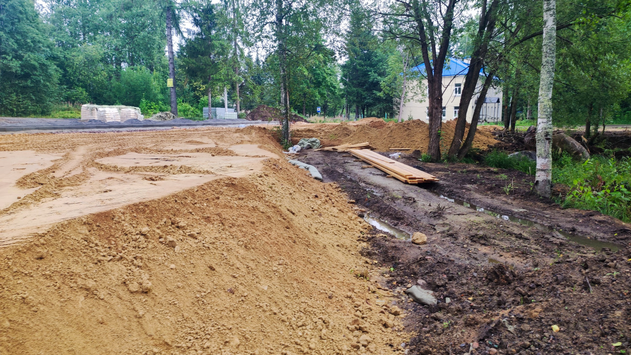 Насыпи песка и лужи на участке благоустройства с подготовкой основания