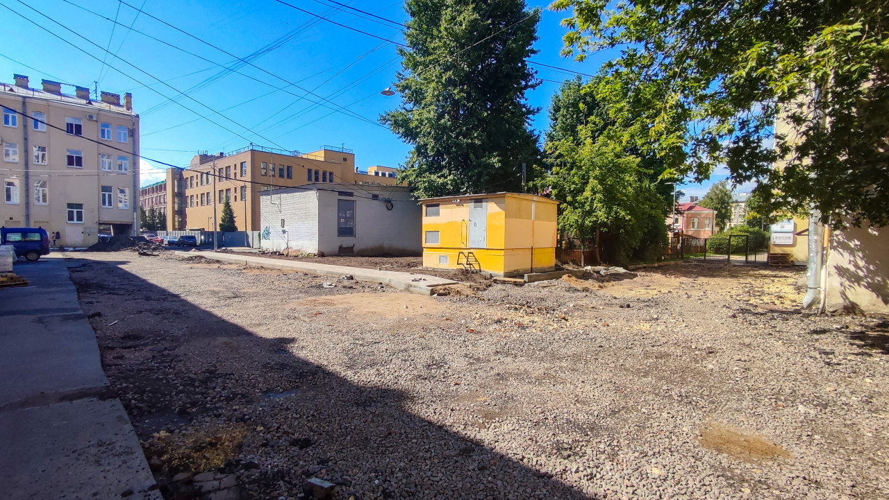 дорога проезд покрытие поверхность дорожные работы инфраструктура городская среда двор дворовая территория строительная площадка реконструкция благоустройство подготовка территории щебень щебёночная подсыпка грунт отсыпка строительные работы технический павильон технический киоск техническое сооружение коммунальный объект инженерное сооружение бетонное основание воздушные провода линии электропередачи электроснабжение деревья тень от деревьев ограждение забор городские здания лужаПохожие фотографии