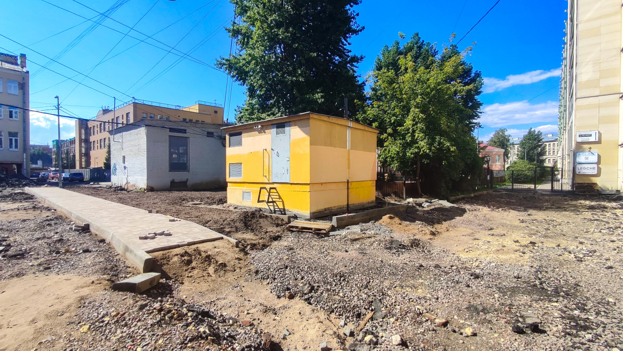 На фотографии показан двор/техническая зона: рядом с небольшим жёлтым модульным павильоном с дверью и вентиляционными решётками ведутся работы по благоустройству. В кадре видны свежая укладка тротуарной плитки с бордюрами, щебёночная и песчаная подсыпка, неровный грунт, строительные остатки и разметочные элементы. По периметру проходят провода и опоры, на заднем плане заметны здания и ограждения. Съёмка на улице при дневном рассеянном свете. Фото подходит для материалов о благоустройстве, ремонте дворов и строительной подготовке территории.