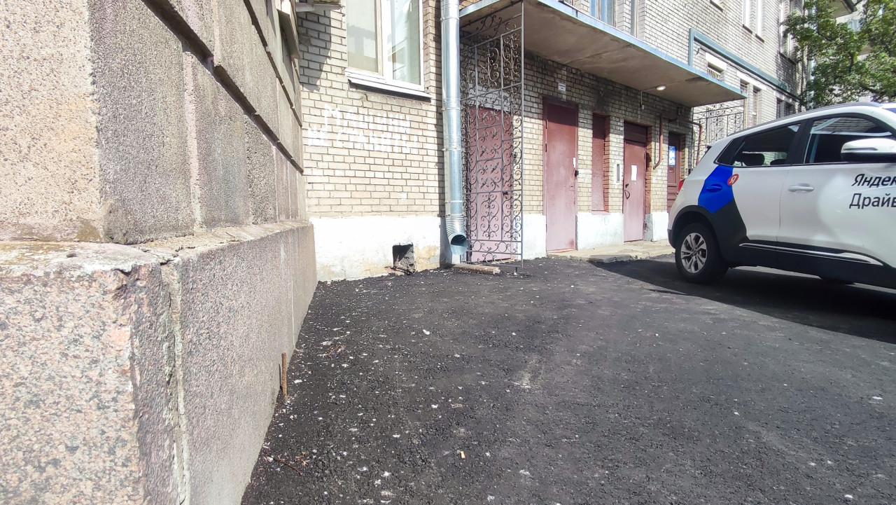 дорога проезд покрытие поверхность дорожные работы строительство благоустройство ремонт двор придомовая территория асфальт свежее асфальтовое покрытие асфальтирование бордюр пешеходная зона парковка припаркованный автомобиль легковая машина кирпичный фасад жилое здание водосточная труба столбики городская среда инфраструктура коммунальные работы ремонт покрытия кусты трава дневной свет тени текстураПохожие фотографии