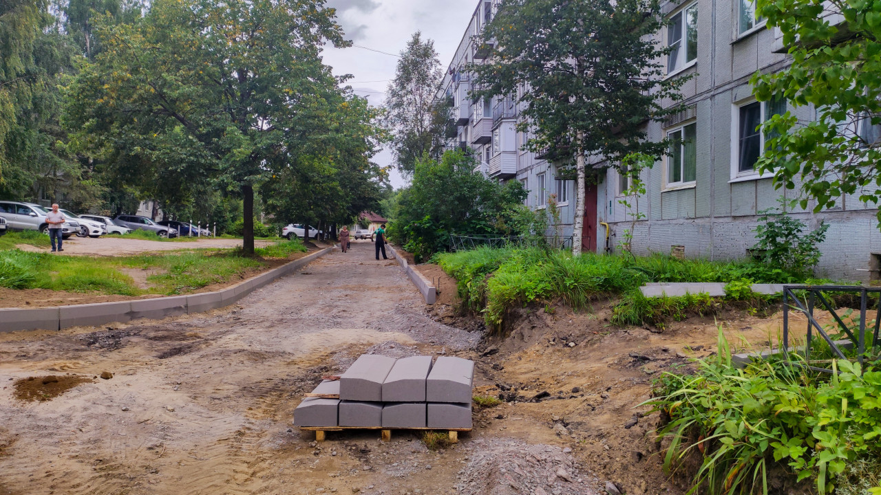 дорога проезд покрытие поверхность дорожные работы город двор благоустройство ремонт двора строительные работы бордюрный камень бордюры паллет строительные материалы монтаж бордюра дворовой проезд снятие покрытия грунт щебень песок траншея земляные работы панельный дом многоквартирный дом подъезд ограждение кусты деревья парковка автомобили коммунальные службы реконструкция городская среда придомовая территорияПохожие фотографии