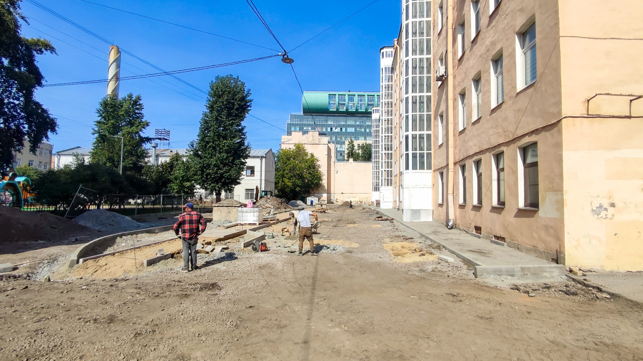 Реконструкция двора: рабочие, разрытый грунт, бордюры и строительные материалы между жилыми домами