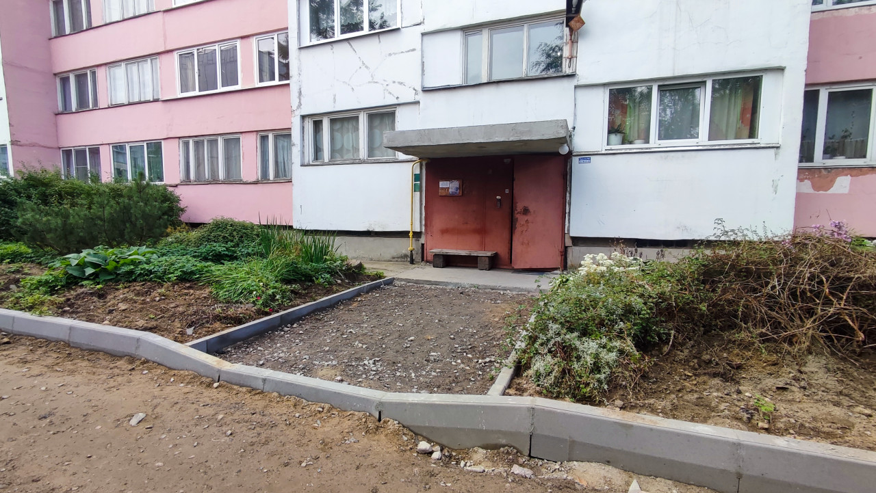Подъезд панельного дома и новый бордюр, формирующий дорожку к входу во время благоустройства