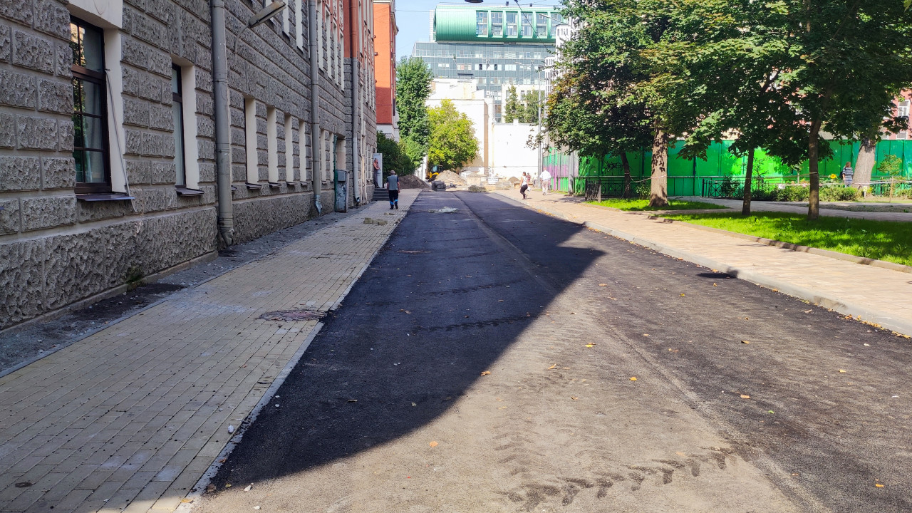 Свежий асфальт на внутриквартальной дороге рядом с тротуаром и зелёным ограждением