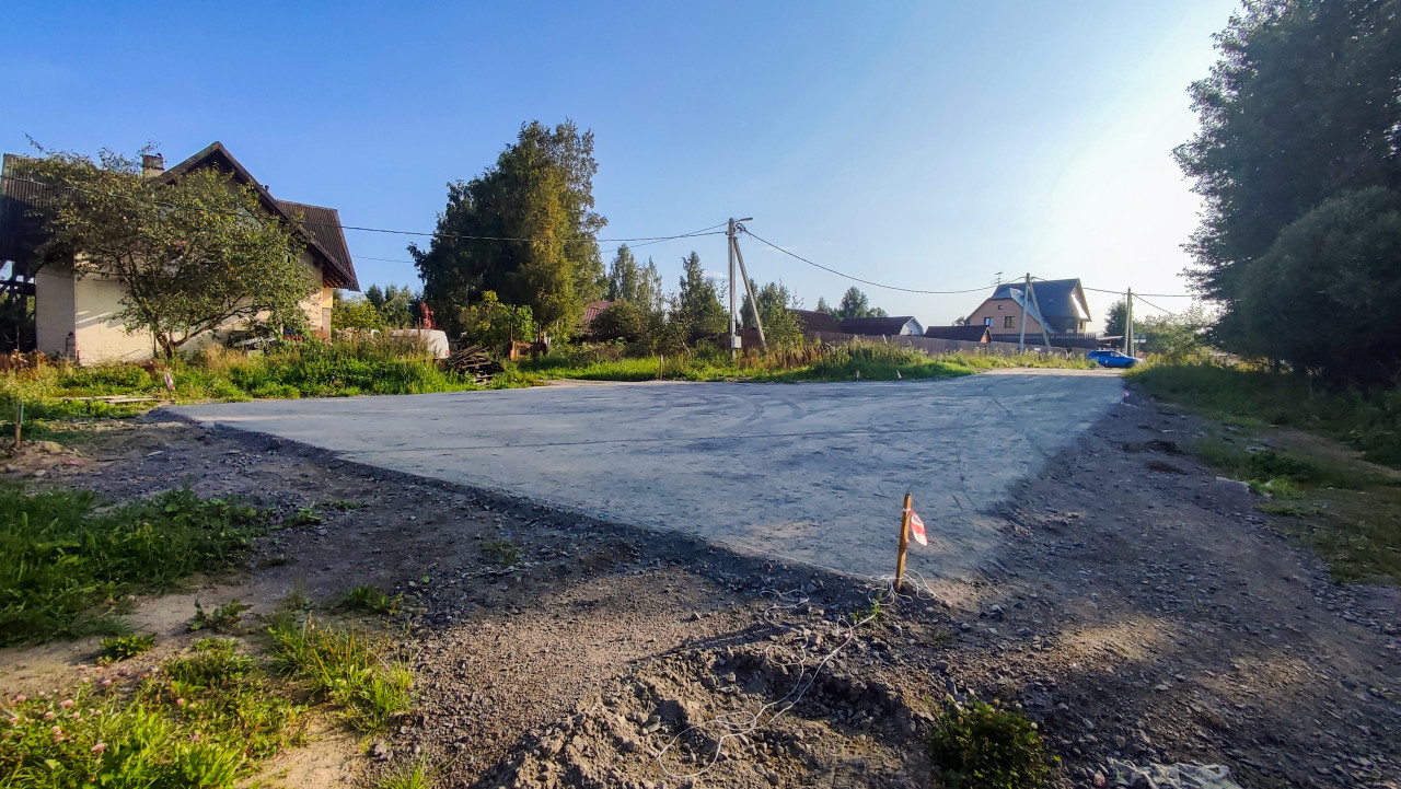 На снимке показан ровный широкий участок проезжей части с гладким светло-серым покрытием, по краям которого видны щебёночные и грунтовые переходы. В центре ближе к переднему плану установлен сигнальный колышек или веха с яркой отметкой, рядом заметны следы от проезда и неровности у кромки. На заднем плане стоят частные дома и ограждения, вдоль улицы расположены опоры и провода. По обочинам растёт трава, присутствуют деревья. Съёмка выполнена днём при солнечном свете. Подходит для тем про ремонт улиц и дорожные процессы.