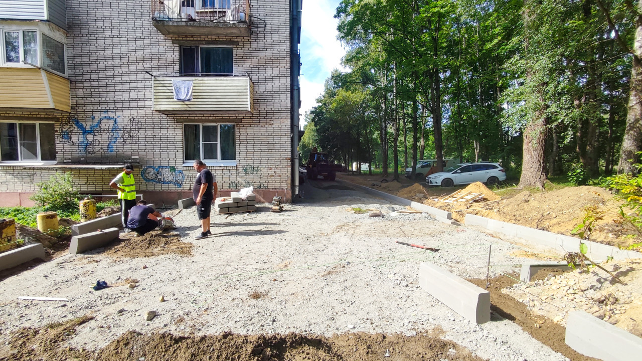 дорога проезд покрытие поверхность дорожные работы строительство благоустройство двор тротуар ремонт двора установка бордюров бордюрный камень щебёночное основание подушка песок разметка разметочный шнур выравнивание рабочие сигнальный жилет спецодежда инструмент бетонные элементы поддоны доски насыпь грунта техника экскаватор погрузчик лесополоса автомобили жилой дом городская среда тёплый сезонПохожие фотографии