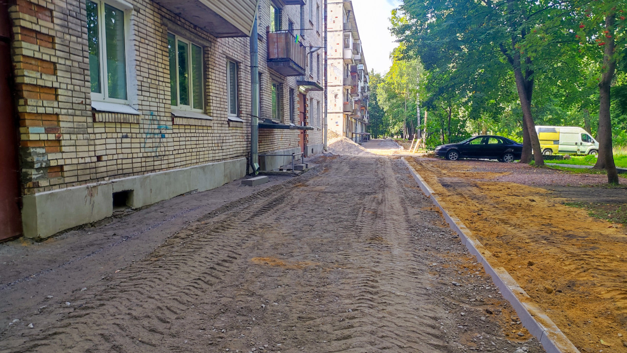 дорога проезд покрытие поверхность дорожные работы строительство благоустройство двор дворовой проезд придомовая территория ремонт покрытия основание щебень гравий песок разравнивание следы шин колея бордюр бордюрный камень установка бордюров кромка проезда кирпичный дом многоэтажка окна балконы водосточная труба парковка легковой автомобиль фургон деревья зелёная зона тёплый сезонПохожие фотографии